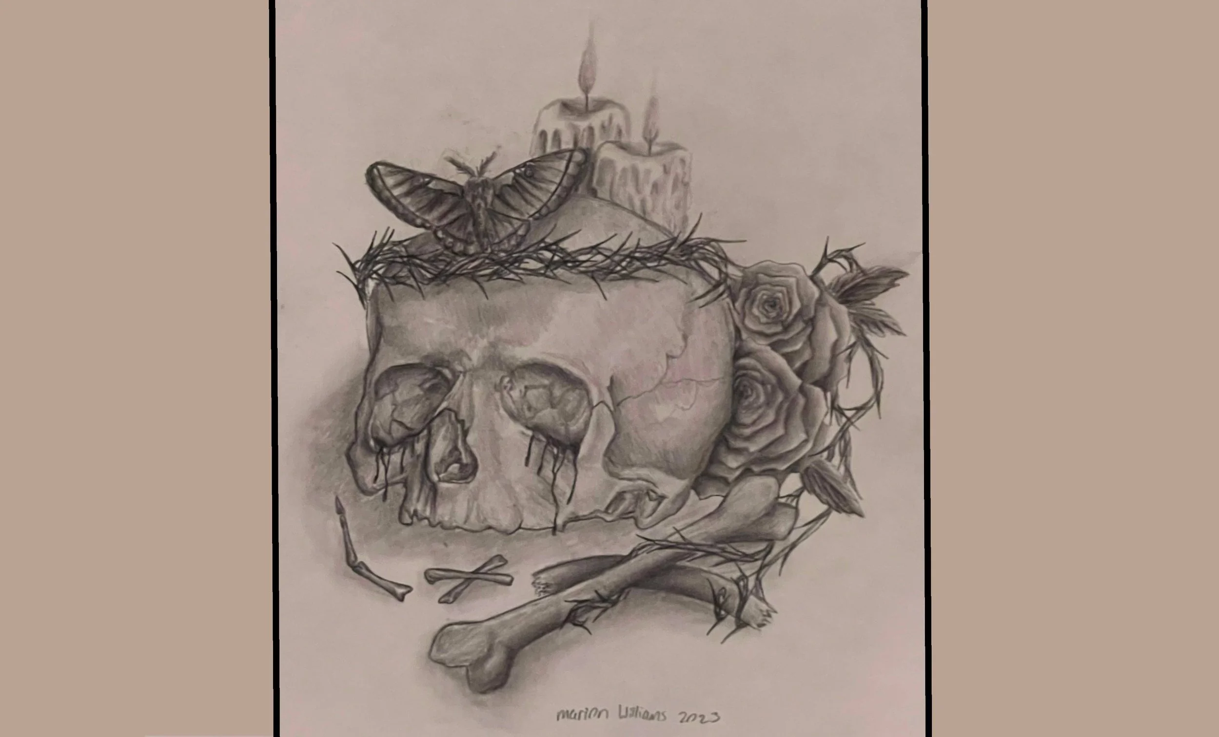 Moth to The Flame is part of a series of three drawings called the Death by Thorns series. The medium that was used is graphite and a blending tool.