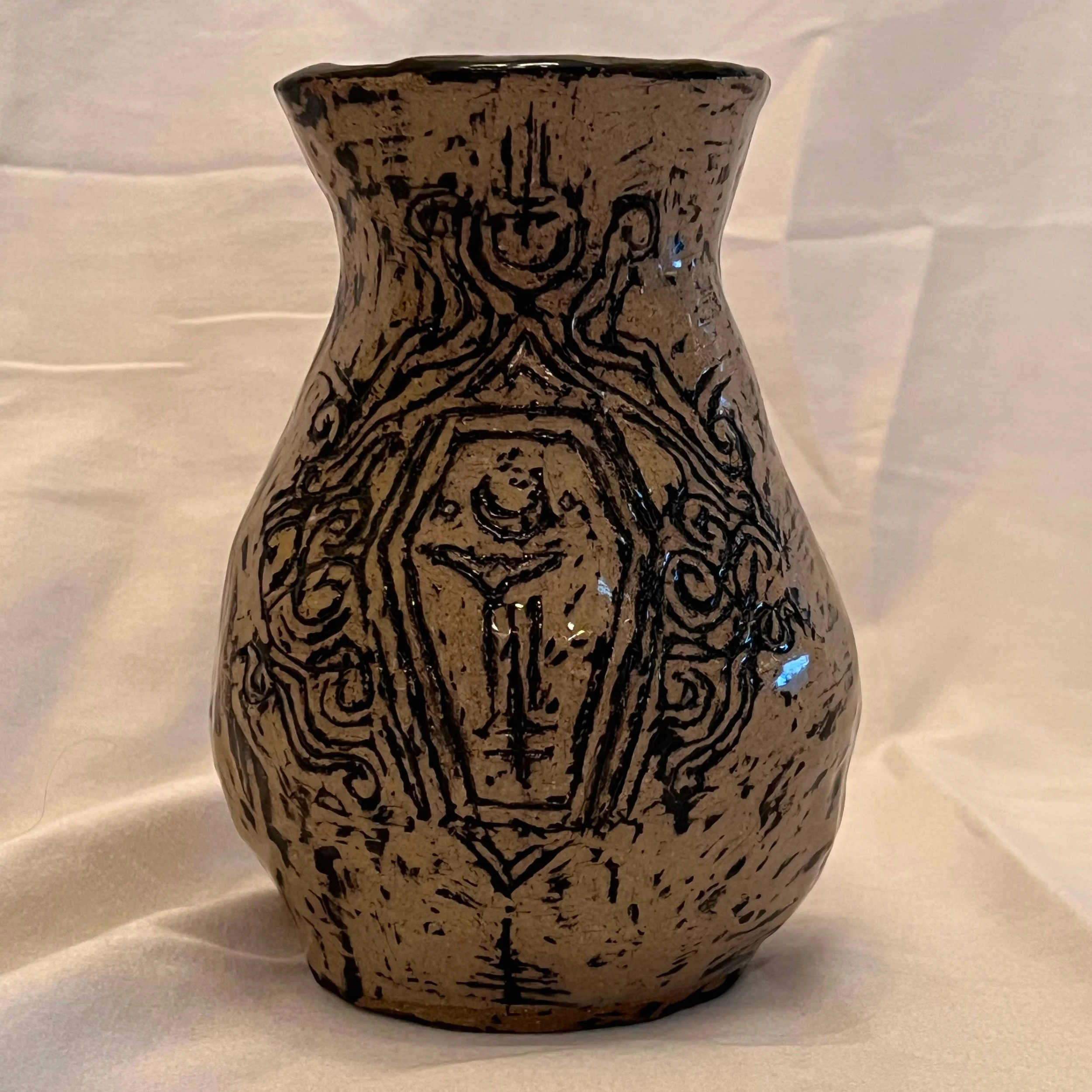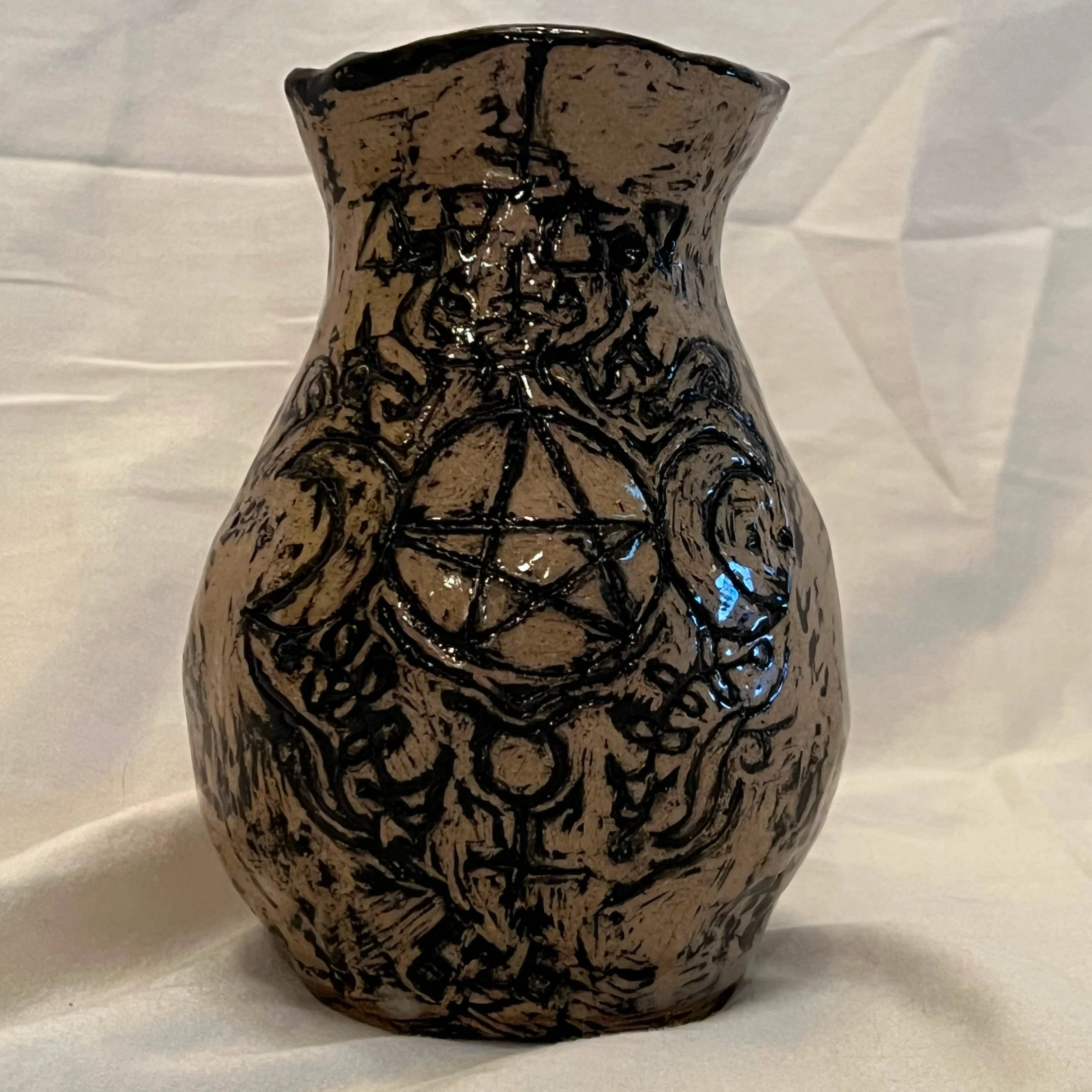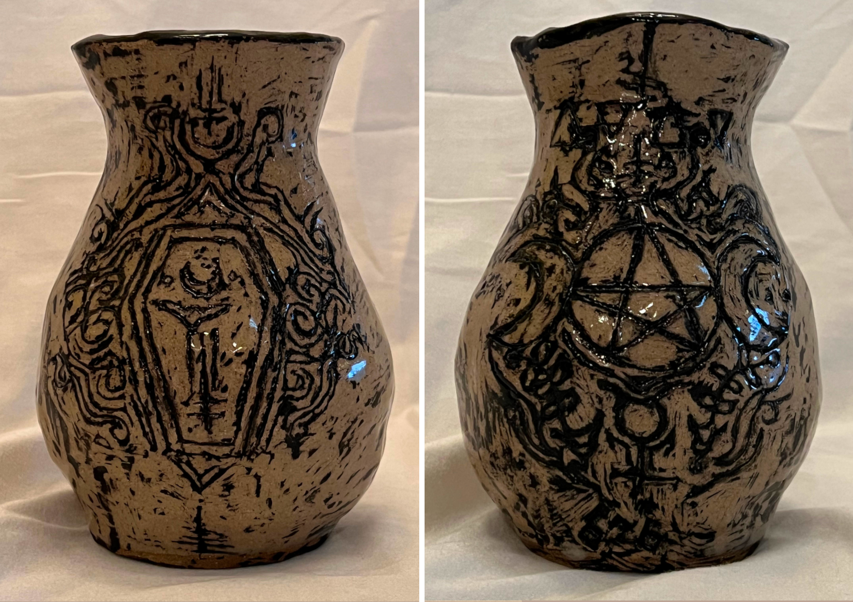 The Vase of Venus was constructed out of coils. I smoothed out every coil and then carved a design on both sides, one being the pentagram and the other being the coffin. The vase was painted entirely with black underglaze in every detail. After that dried, I scraped away the underglaze leaving most of the black underglaze to the design. Finally, the vase was finished in a clear glaze.